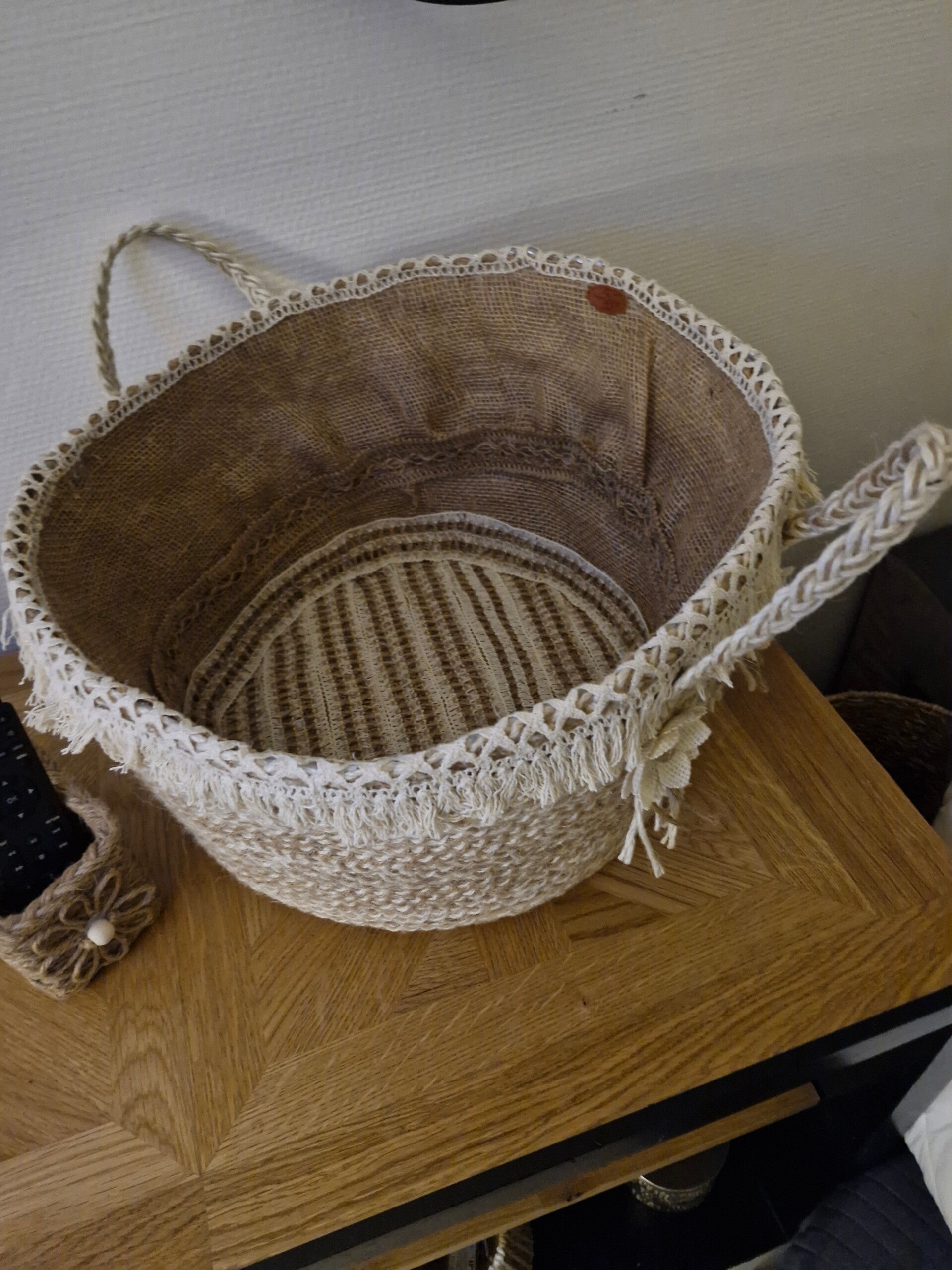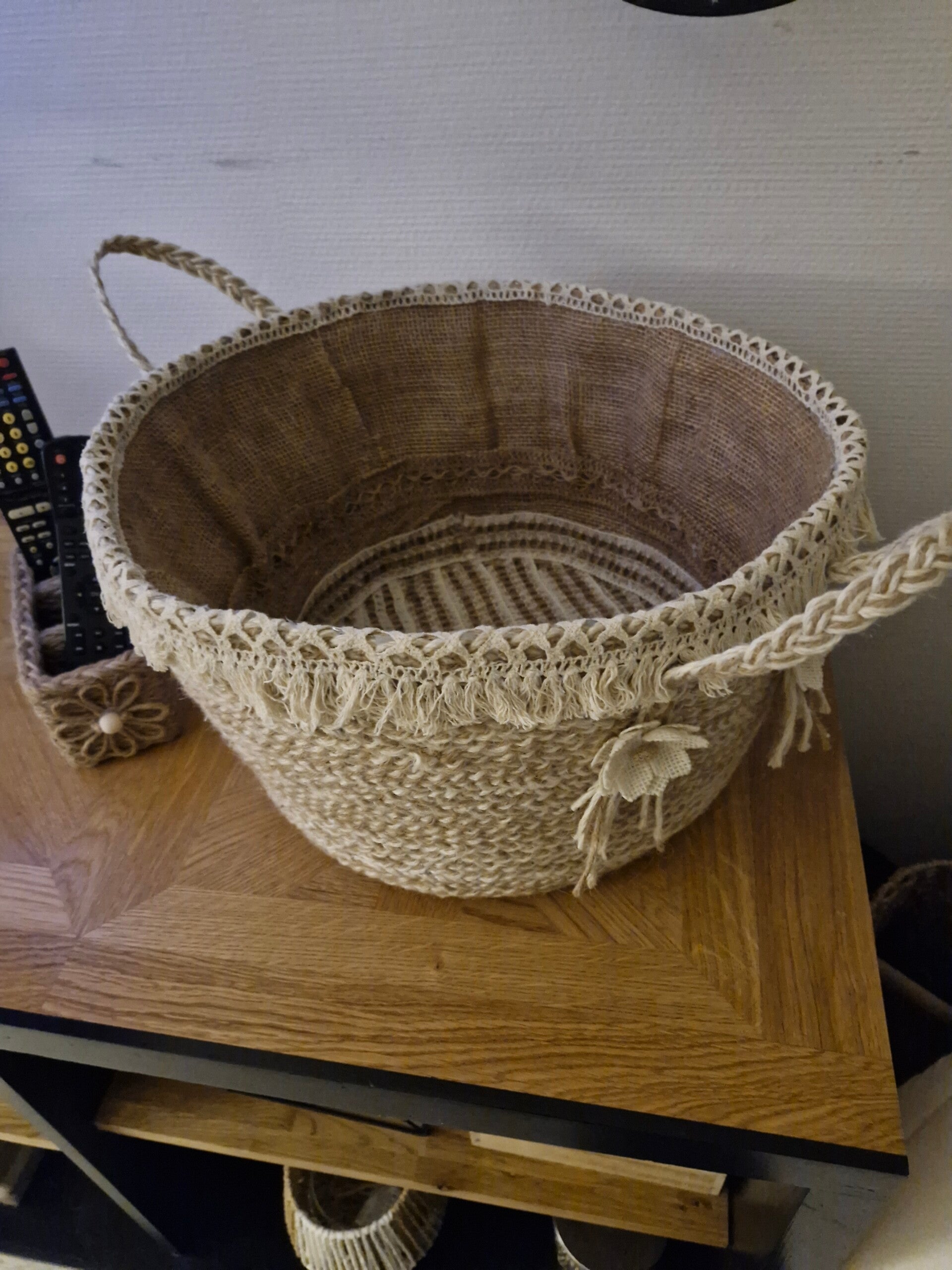 Entièrement réaliser à la main cette jolie corbeille est faites pour vous. Entièrement tresser à la main en corde de jute, cette corbeilles saura trouvez sa place dans votre intérieur. Plusieurs coloris et modèles disponibles. Me contacter avec vos couleur et vos envies et je réalise 😊👋